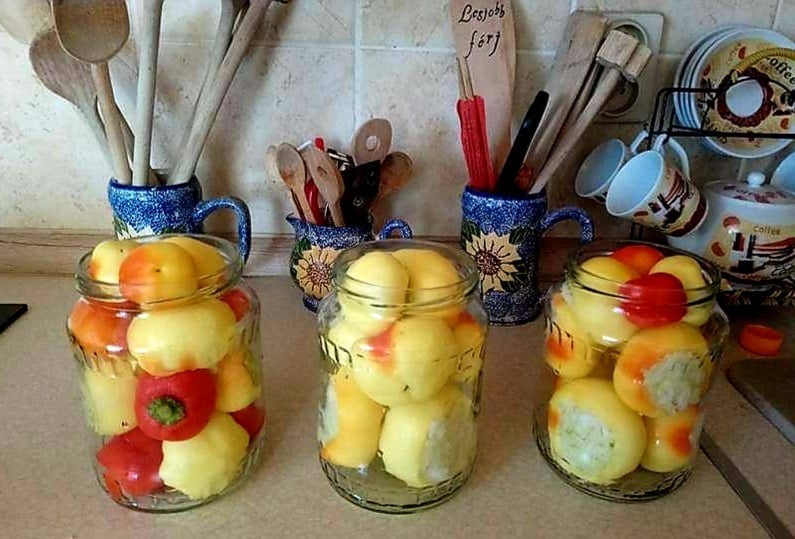 A savanyúság ugyanúgy készül, mint mindig: a káposztát apróra vágjuk, egy nagy tálban besózzuk és állni hagyjuk. Az almapaprikák magházát kivágjuk, a paprikákat alaposan megmossuk. A káposztát miután a sótól levet engedett kicsavarjuk és beletöltjük az almapaprikákba. Az arcokhoz a káposztába a borsokat beleszúrjuk szemeknek, és a paprikát belenyomkodjuk szájnak. Az arcokkal az üveg falának kifelé a megtöltött paprikákat a befőttesüvegbe rakjuk, ráöntjük a levet és lezárjuk. Kidúnsztoljuk a savanyúságot, de én csak egyet hagyom forrni, és már le is kapcsolom.