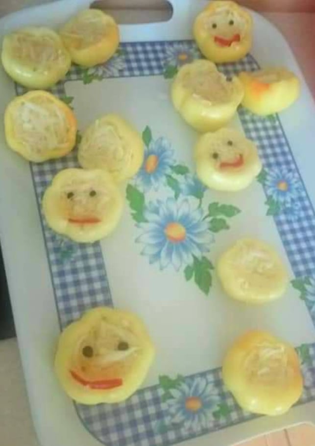 Én ezt a káposztával töltött almapaprikákkal oldottam meg. Az egyik kedvenc savanyúságunk segítségével egyszerűen formázhatunk meg egy-egy mosolygós arcot is. Nincs másra szükségünk, csak pár szem feketeborsra, ezek lesznek a szemek. Valamint piros húsú paprikára. Ebből vágunk félkör alakú darabokat mosolygós szájnak.